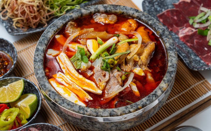 Điều làm nên “thương hiệu” của quán là tô bún bò được dọn trong thố đá sôi ùng ục, giữ nhiệt tới 300°C. Nước dùng nấu theo phong vị Huế, đậm đà và thơm nức, ngọt thanh từ xương bò, điểm chút cay của ớt và mắm ruốc. Thịt bò thái lát mỏng, tươi mềm, ăn kèm bún, rau sống và đủ loại topping như giò heo, chả lụa, chả cua…